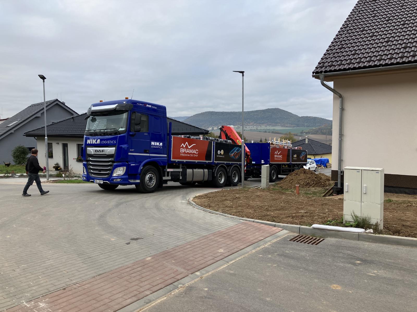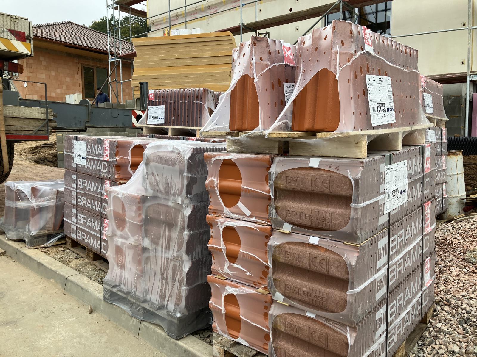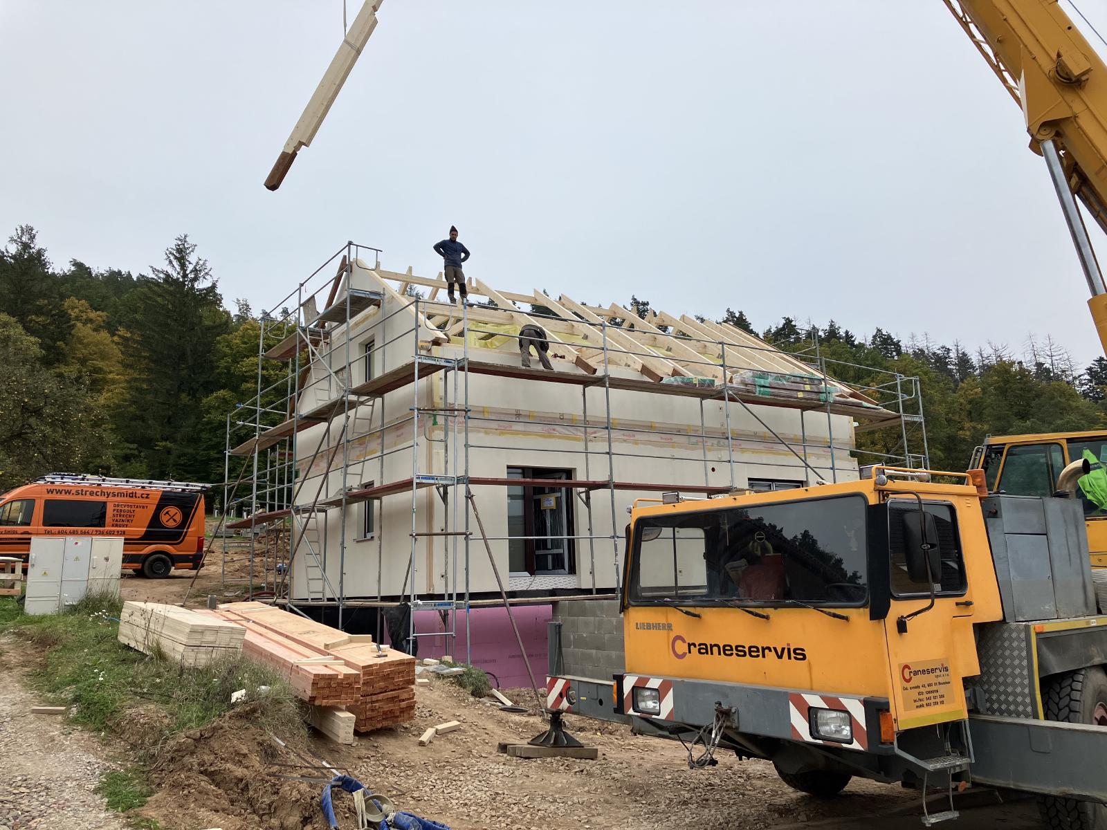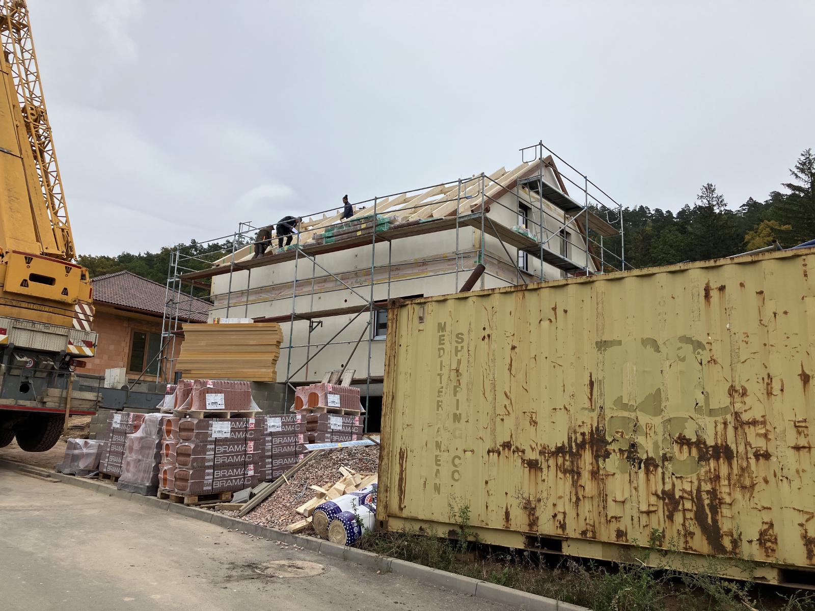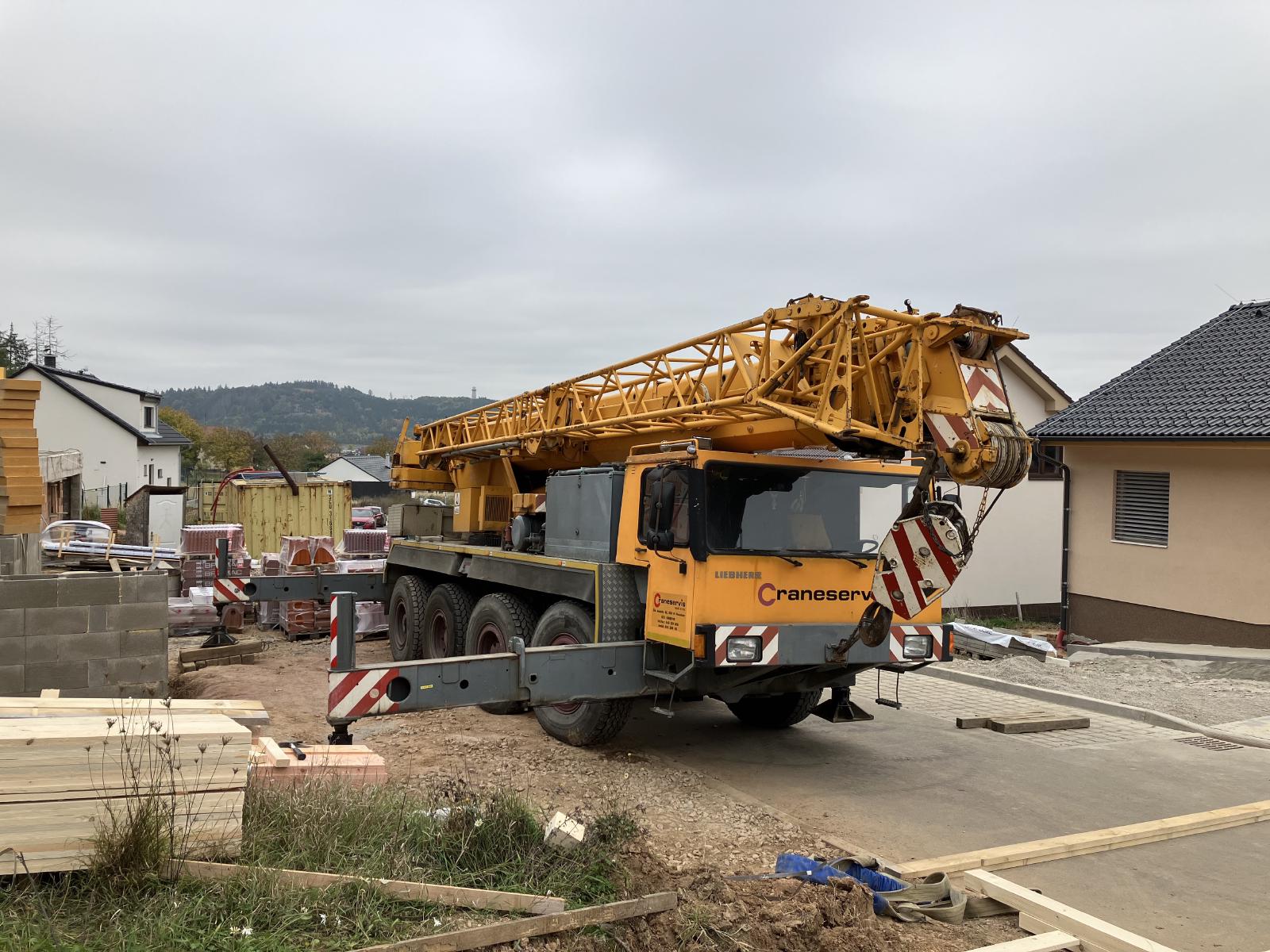 The crane brings up the first of the second floor ceilings and the roofing tile truck uses its own mini-crane to start offloading the pallets of tiles.
