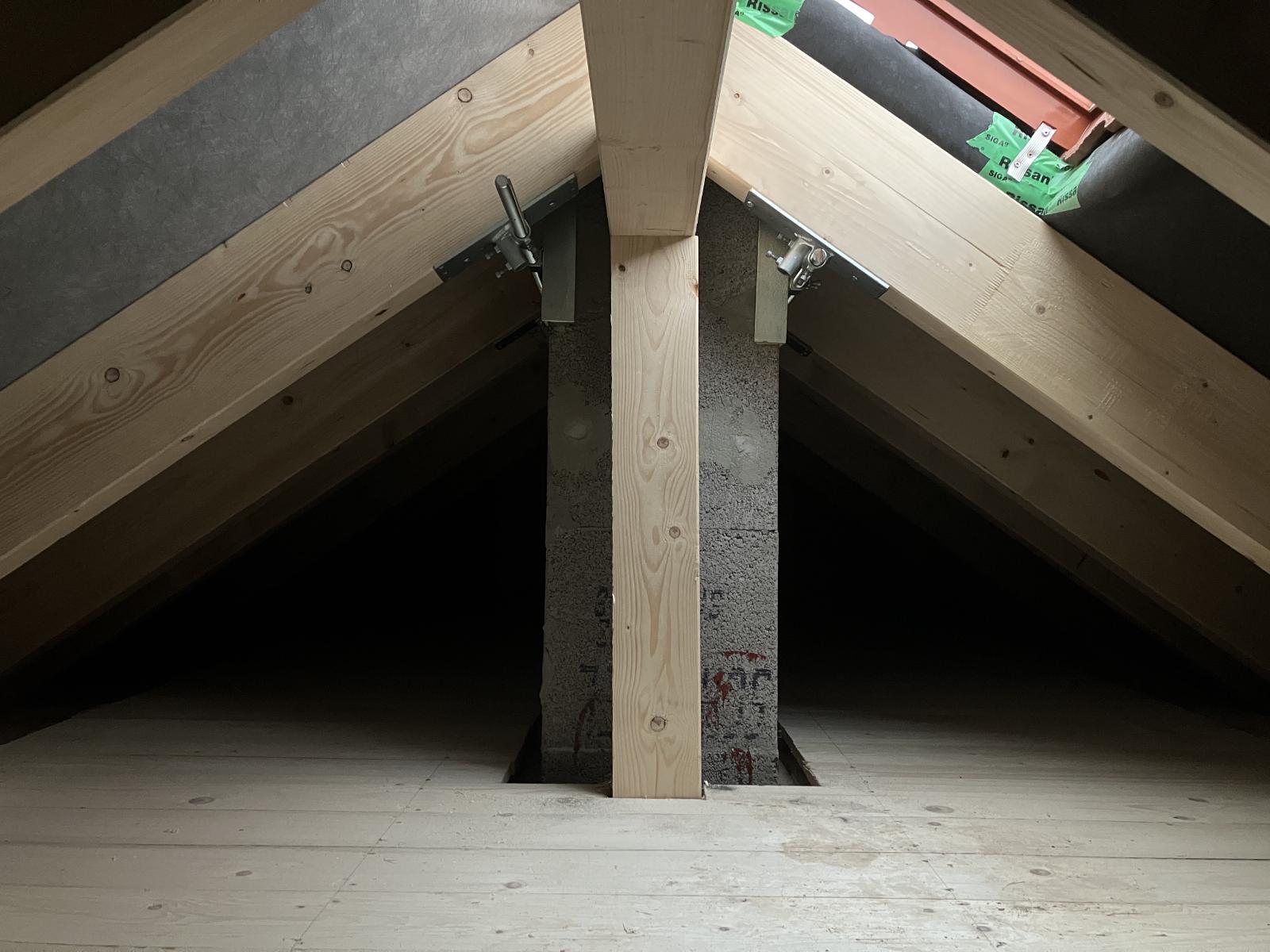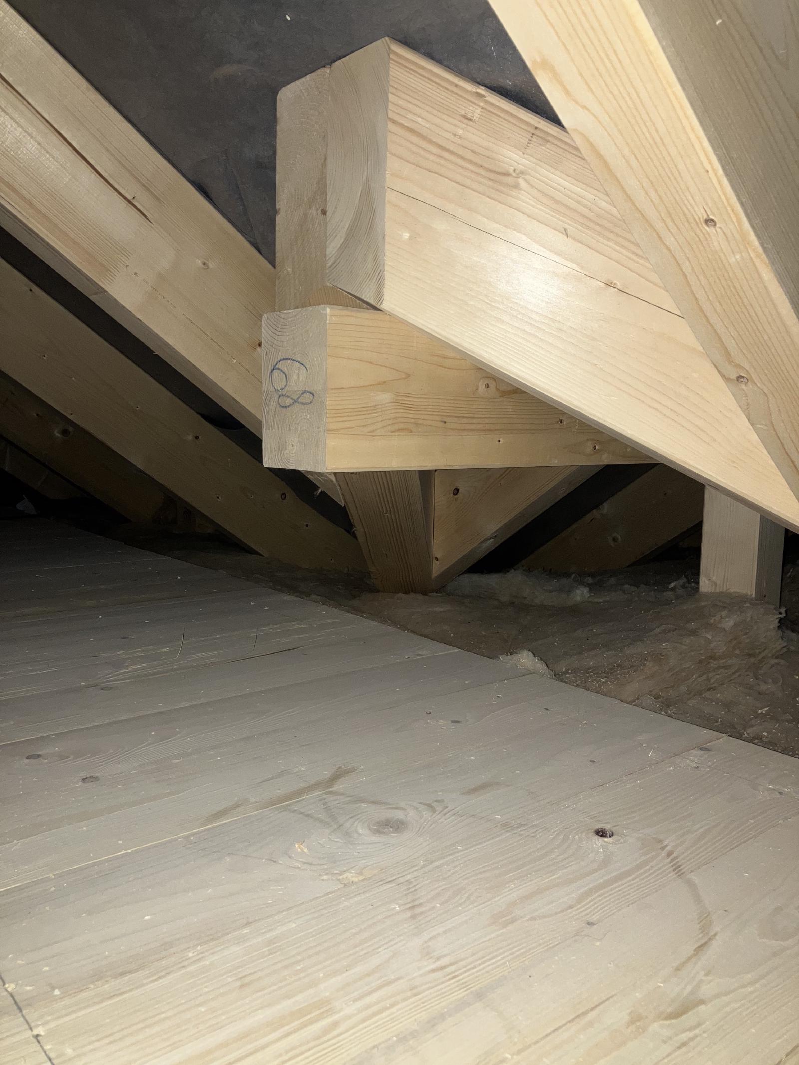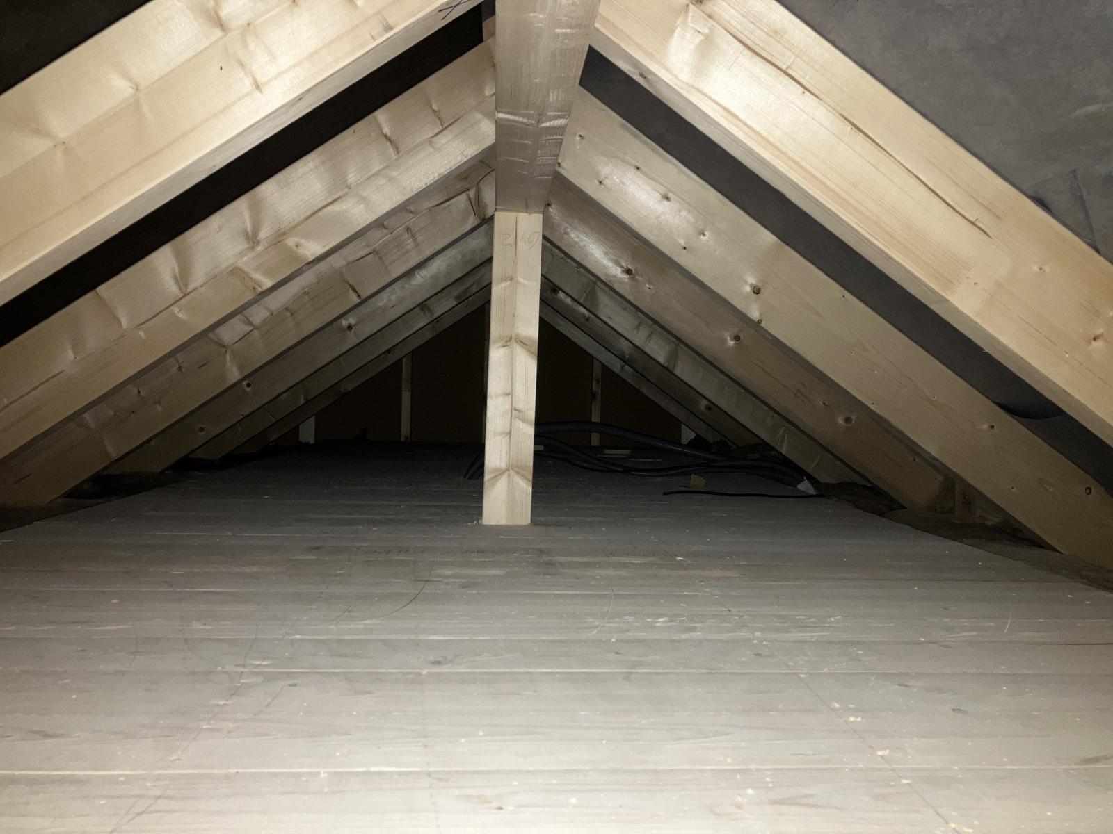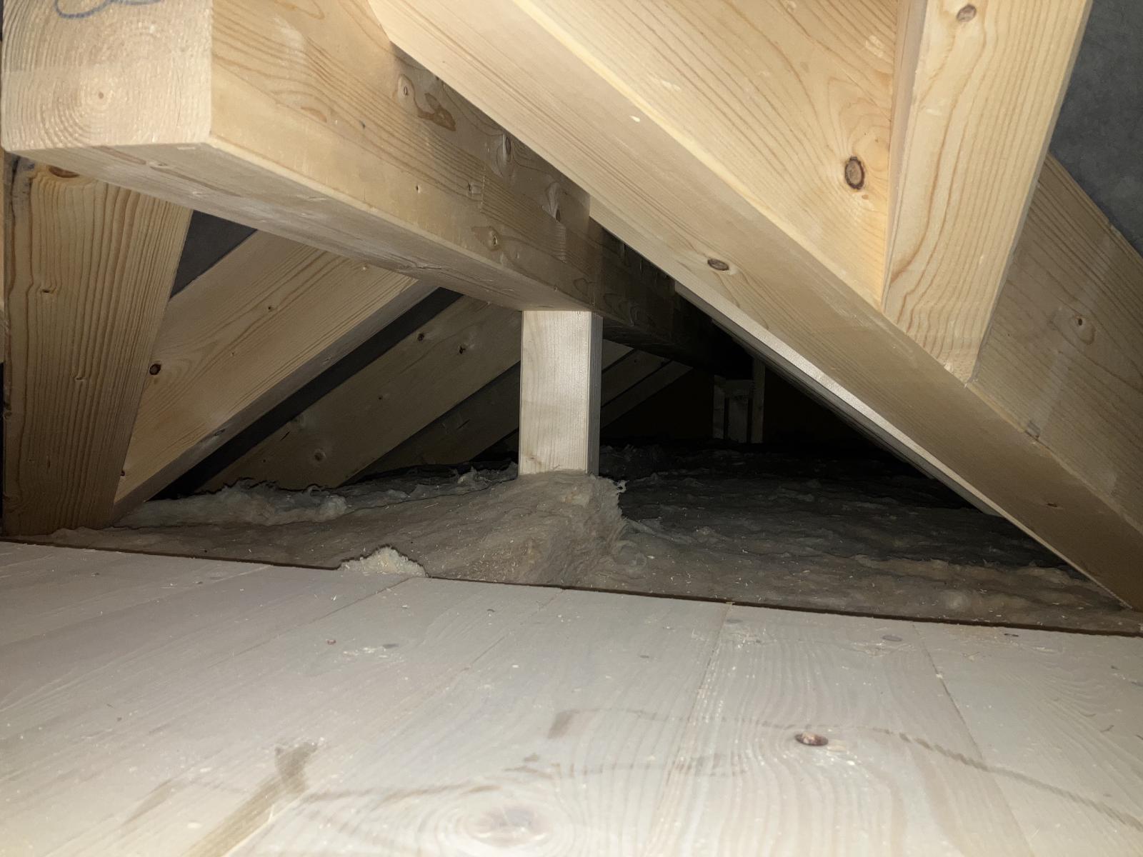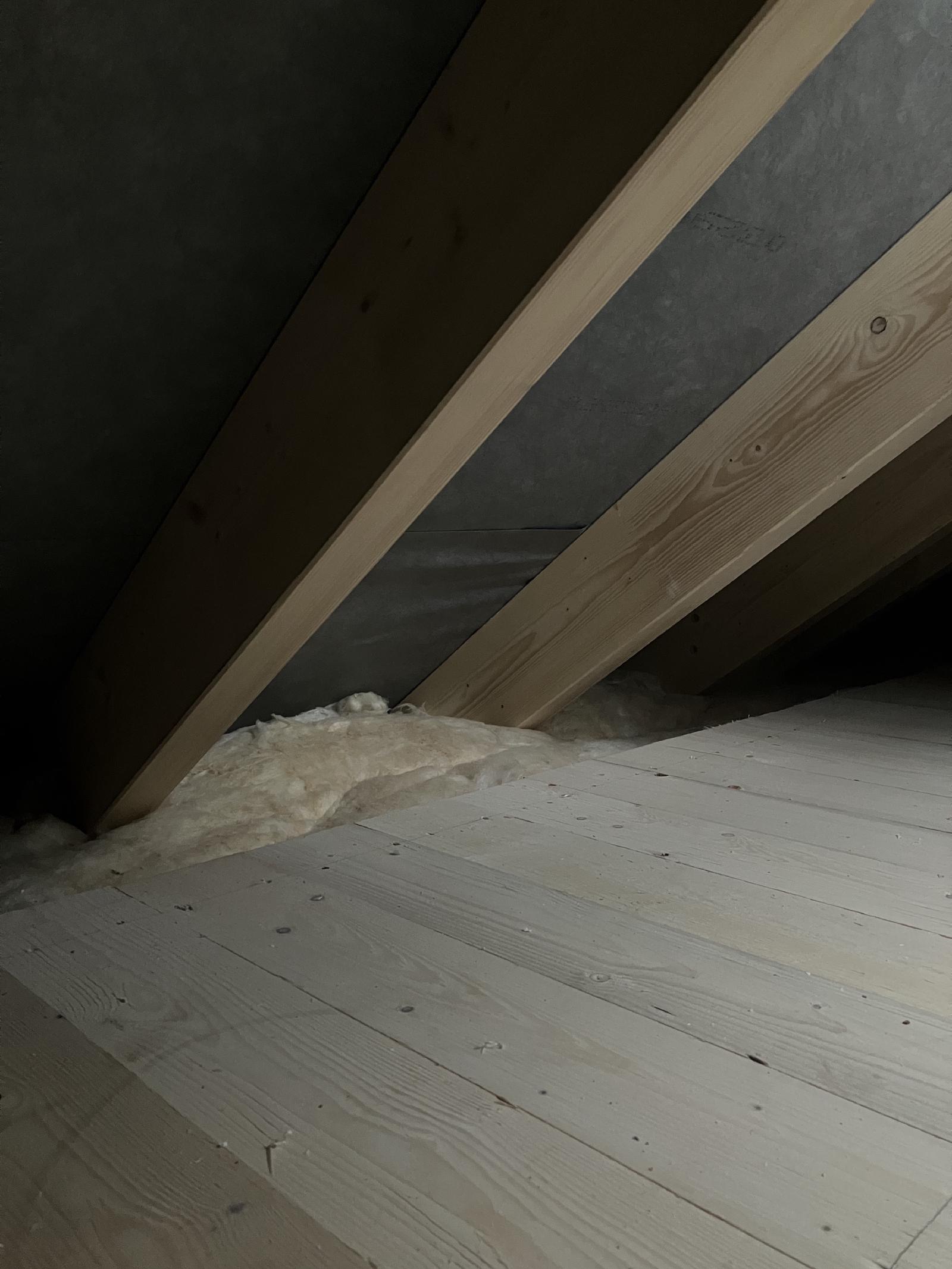 Attics are pretty boring but I figured I’d still share it. They have been spending a lot of time up here this week because, as you can see, there’s newly added insulation of various types up between the rafters and also down at the level where the floor meets the roof.