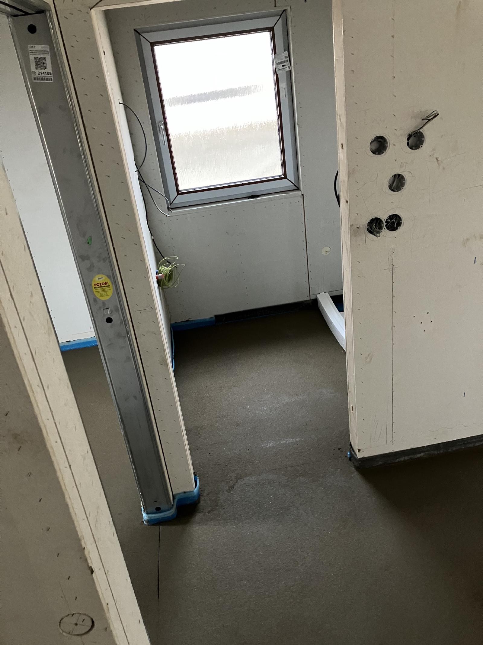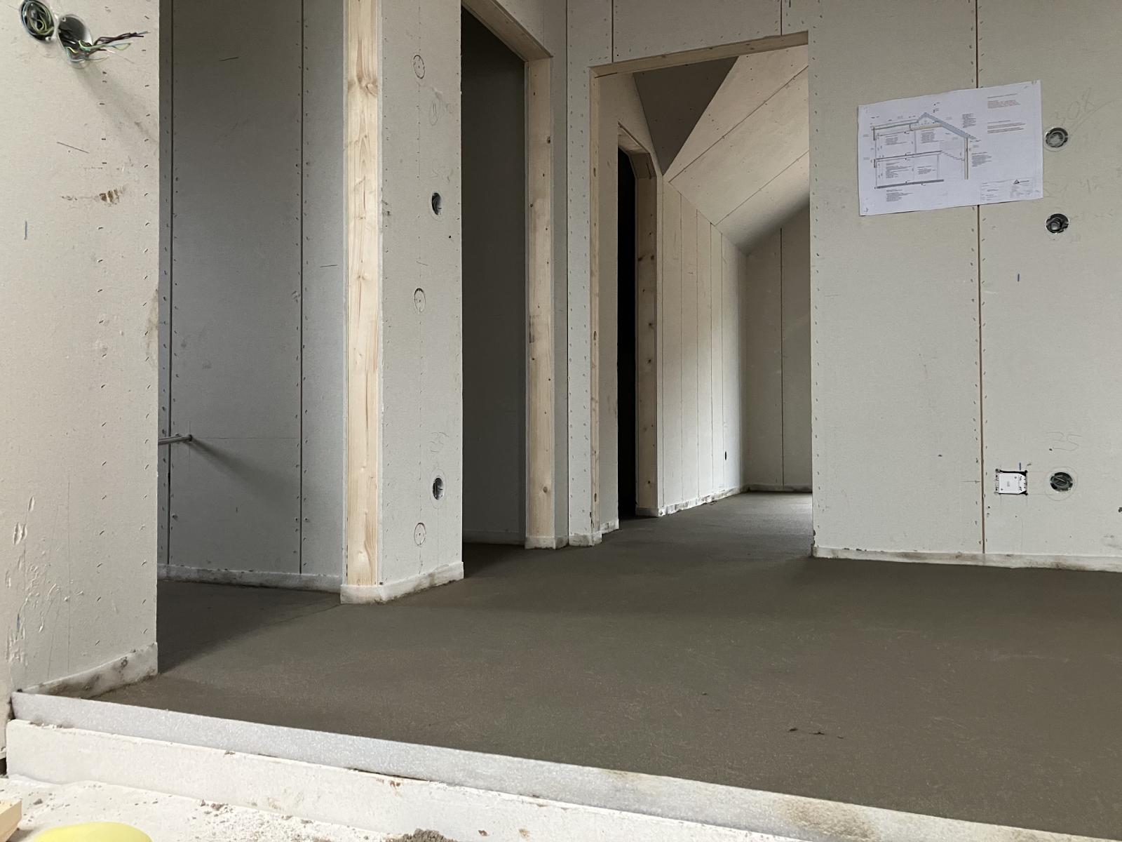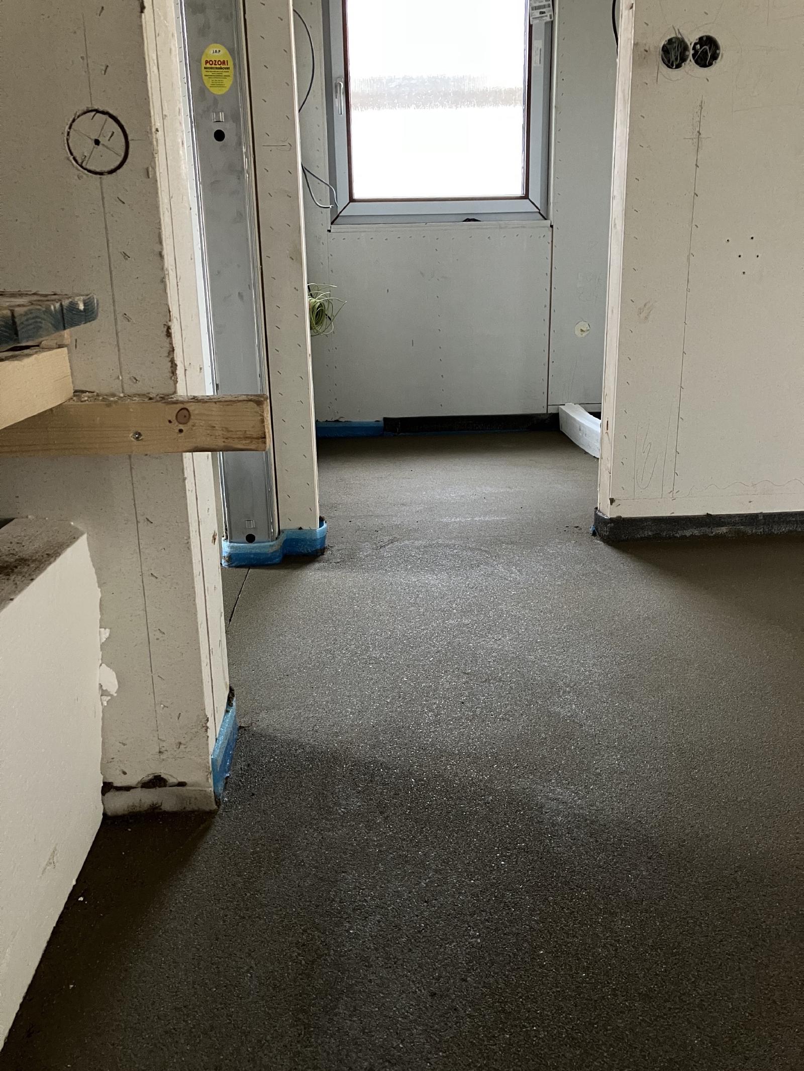 This week was a big one. Again, going back to the idea that this is a “wood frame”, albeit from panels, I assumed that the entire flooring structure would be wood as well. It turns out that I was wrong. The floors are concrete. So basically, what happens, as you’ll see in the photos below is that on BOTH levels, a layer of foam goes down on top of the existing subfloor (this is the concrete floors you’ve seen every week on the main floor and the wood subfloor that you’ve seen on the upper floor) and then concrete is poured over that.