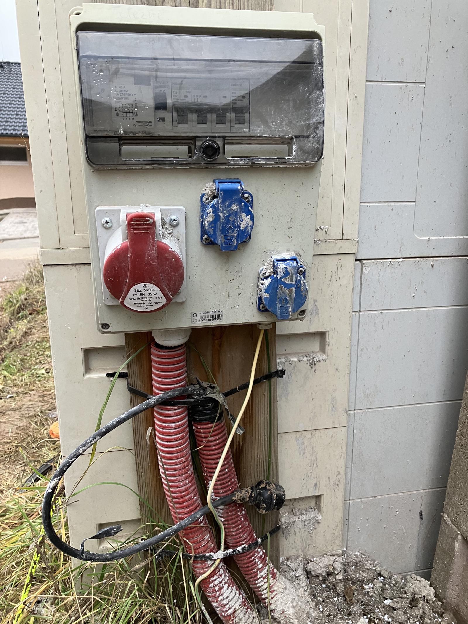 You can see the end result in the photo below. This is our temporary construction electric box and the black muddy cable is what had been buried under the concrete. It’s all good now though so work continued.