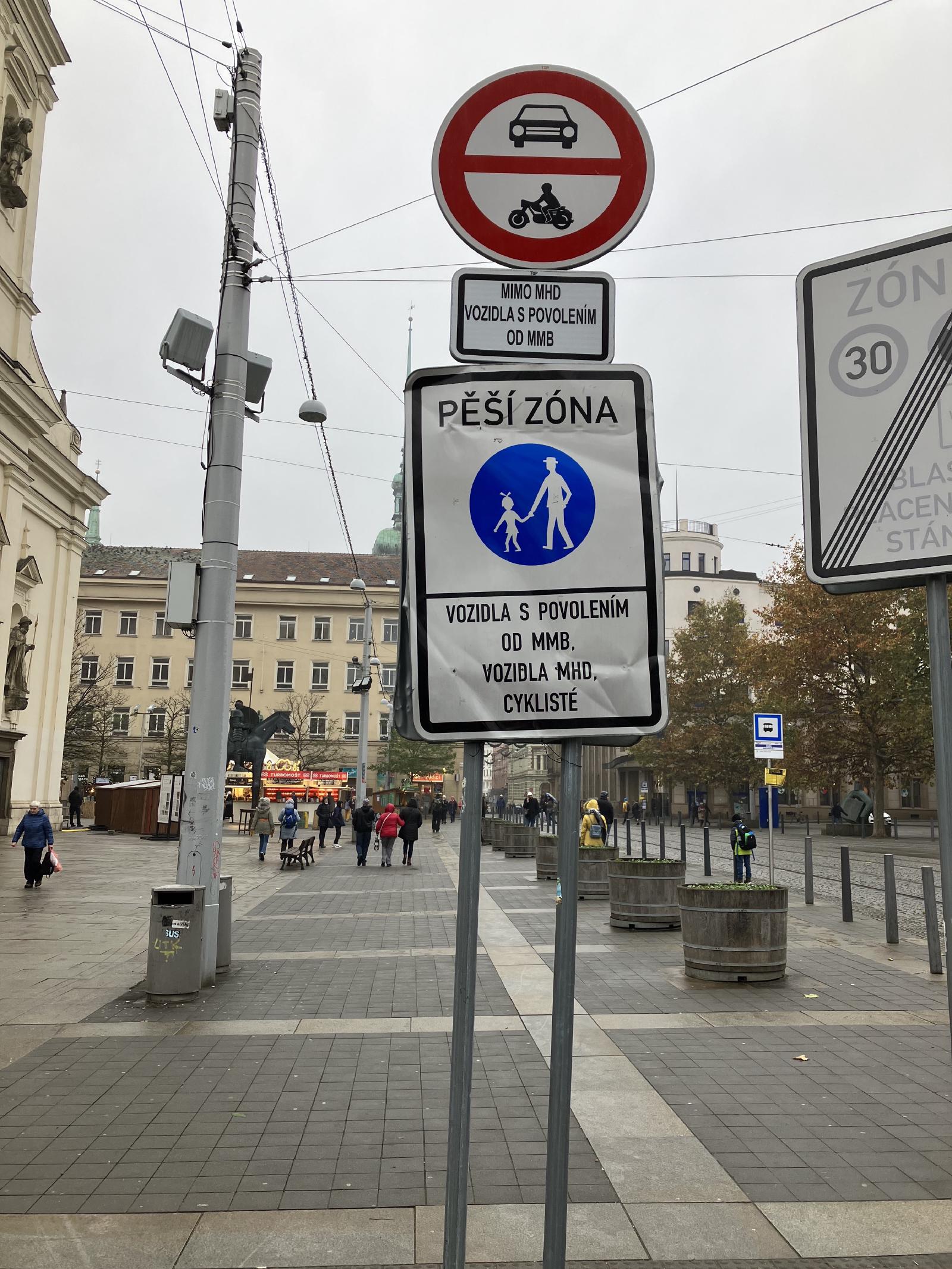 of a few trams, emergency vehicles and bicycles. The PĚŠÍ ZÓNA signs mean