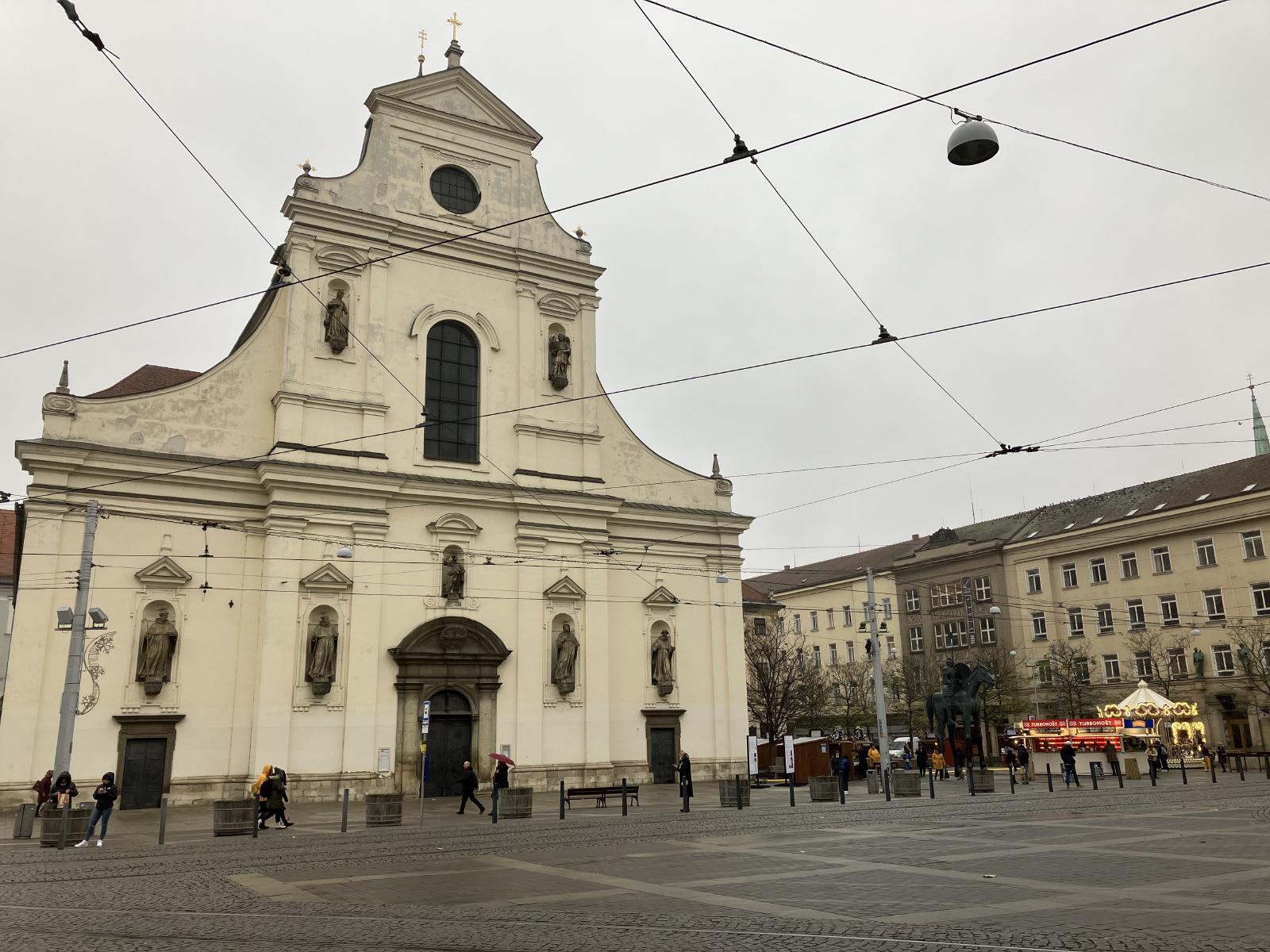 Across the street, but still part of Moravské Náměstí is one of the many churches in Brno. By a rough count, there are 12 churches just in the Brno city center, about 3/4 of which are Roman Catholic. One of these is the Church of St. Thomas that you see below. It is a baroque style church that was built between 1665 and 1675 to replace a gothic style one that was damaged during the Thirty Years’ War in the early 1600’s.