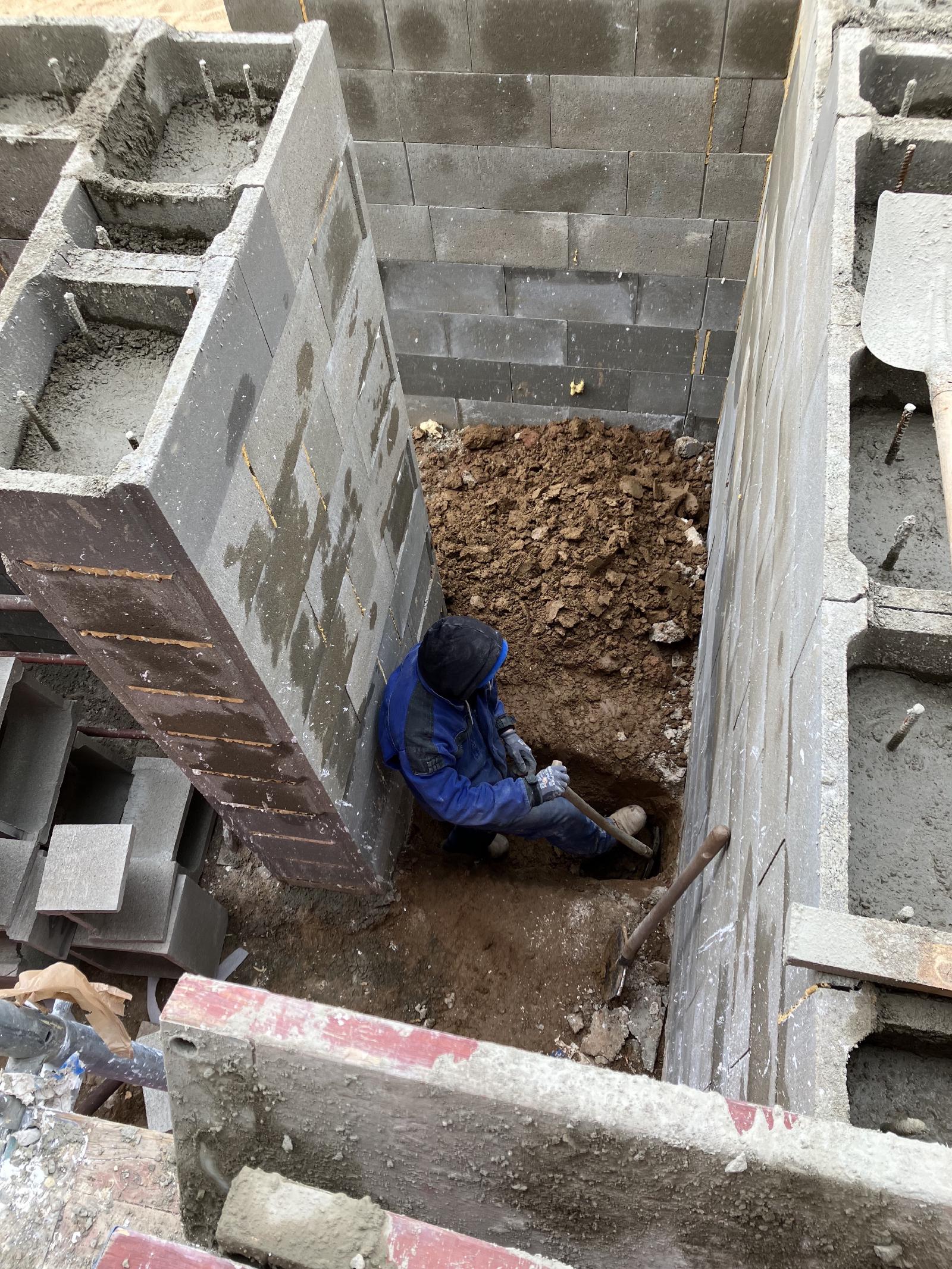 Standing directly in front of the front door and looking down, you can see the blocks being removed for the doorway. When this room is done, it will be insulated because it is right next to the house and so we have no idea what kind of climate it will have. Once we’re in the house, we’ll plan to have some sort of thermo- and humidi-stat so that we can keep track of the year round temperature and humidity. Depending on conditions, it could be used for anything from gardening storage, fruit/vegetable storage or a wine cellar. Ultimately, the conditions will dictate what we’ll use it for.