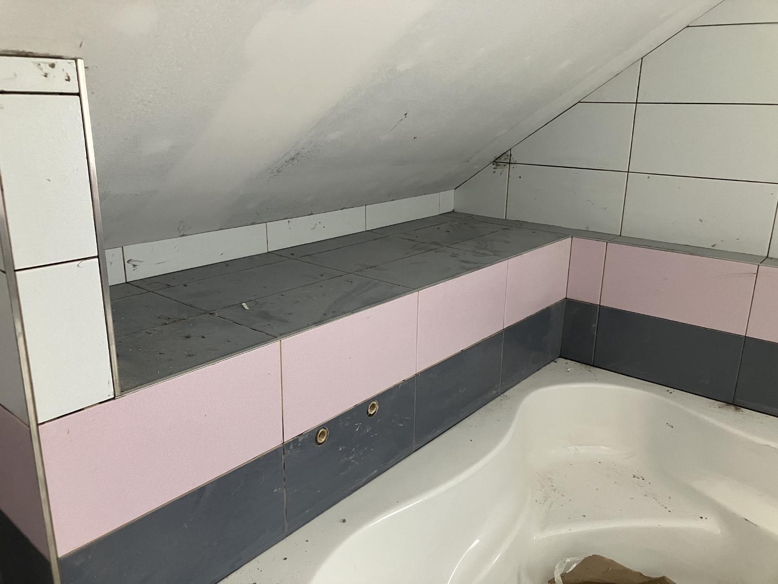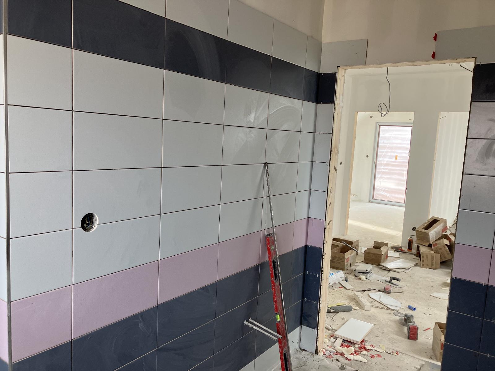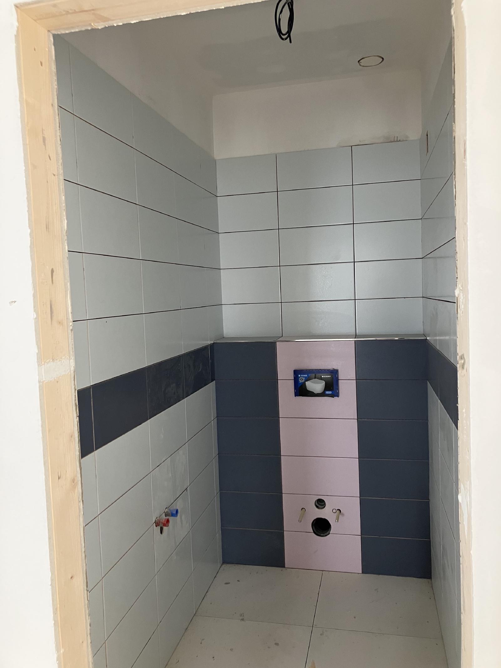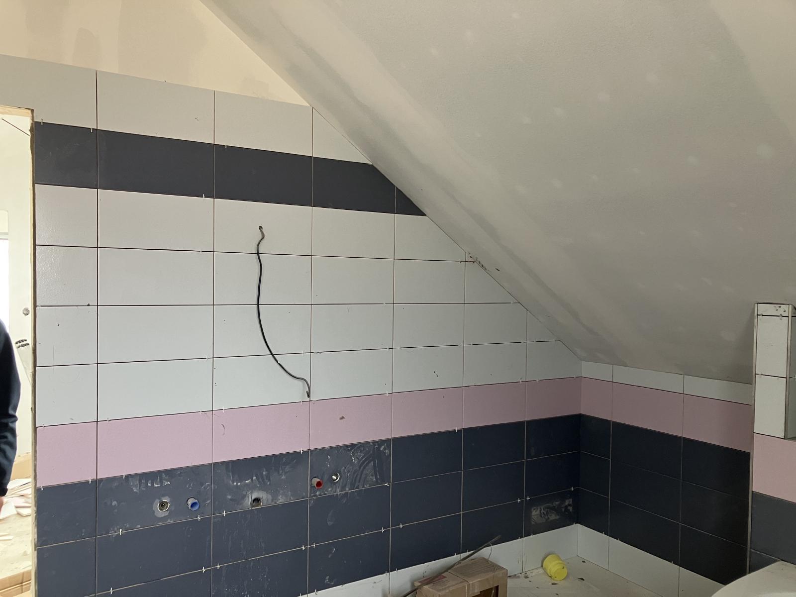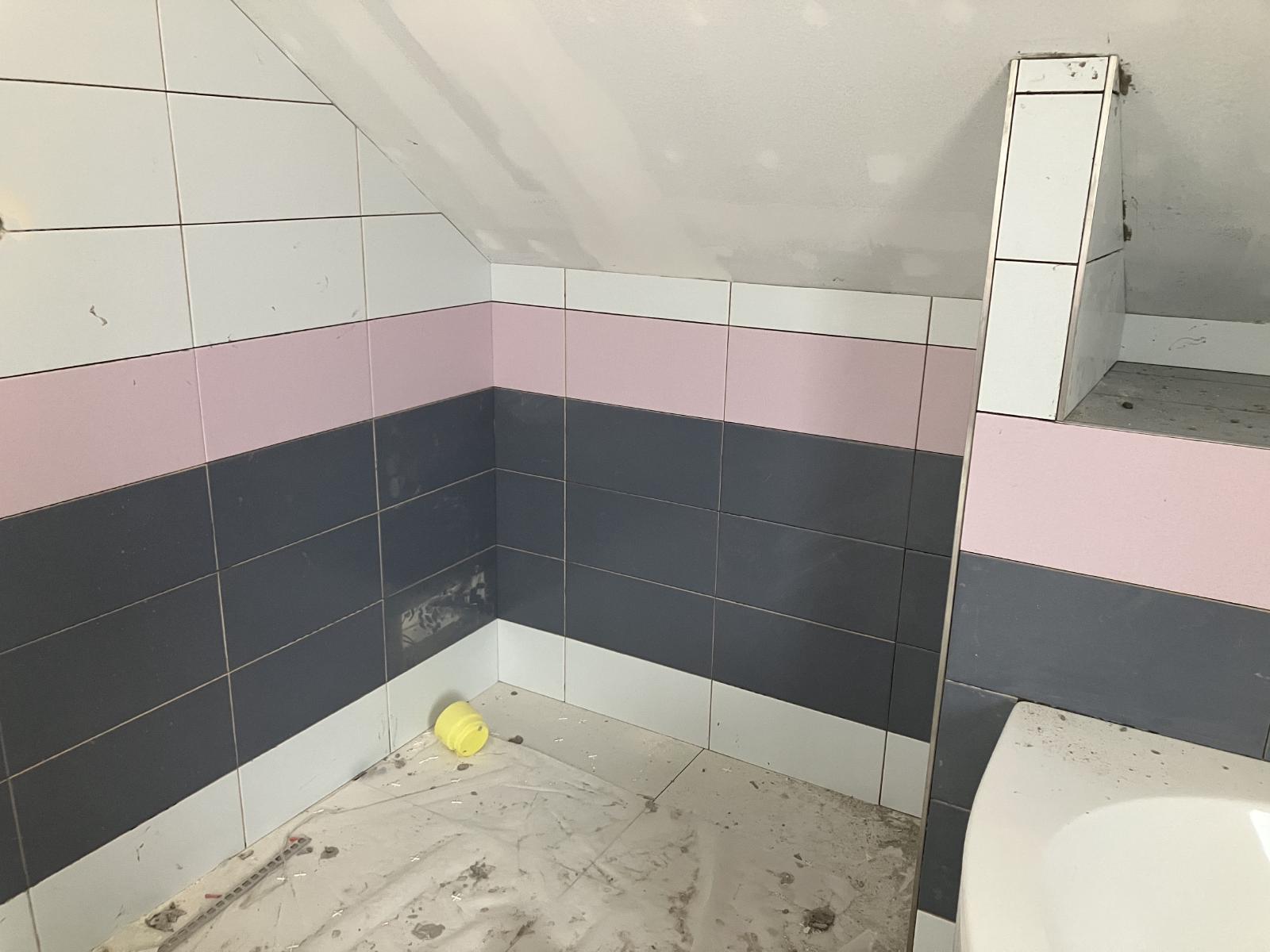 The tiles are done in the upstairs toilet. All that’s left is grouting.