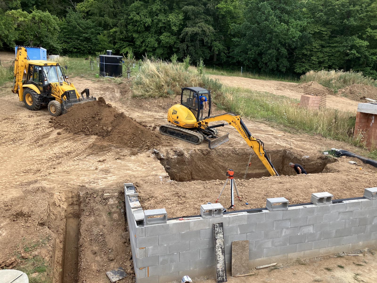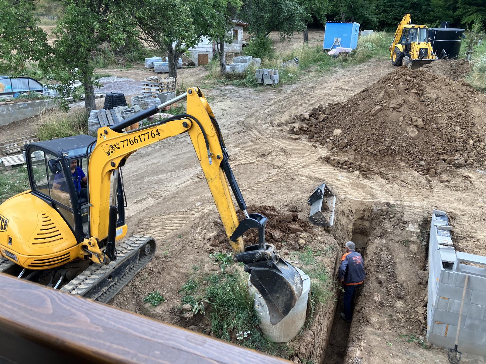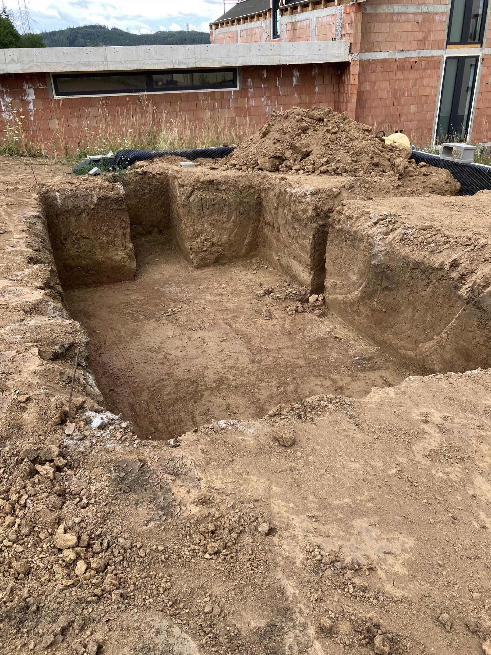 Saša and his guys recovered from heatstroke and returned from vacation and have been hard at work in the backyard. They dug the hole for the pool which is actually about twice the size of the pool. The pool is a plastic shell which will get dropped into the hole but before hand, there needs to be a concrete base layer. After that, then the pool itself is set in and concrete is slowly added in layers around the outside of the pool.