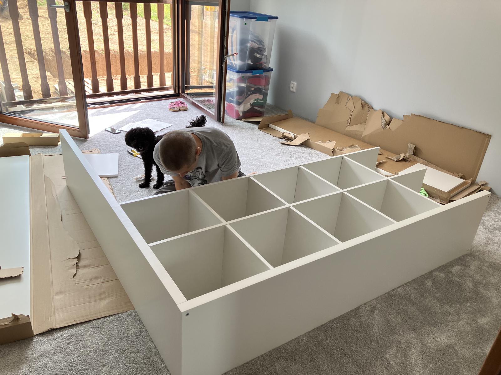 We did the same thing in the guest bedroom. The wall of XXL Bauhaus boxes on the left is intentionally stacked like that to give an idea of how the view into the room would look with full height cabinets installed on that wall to the left.