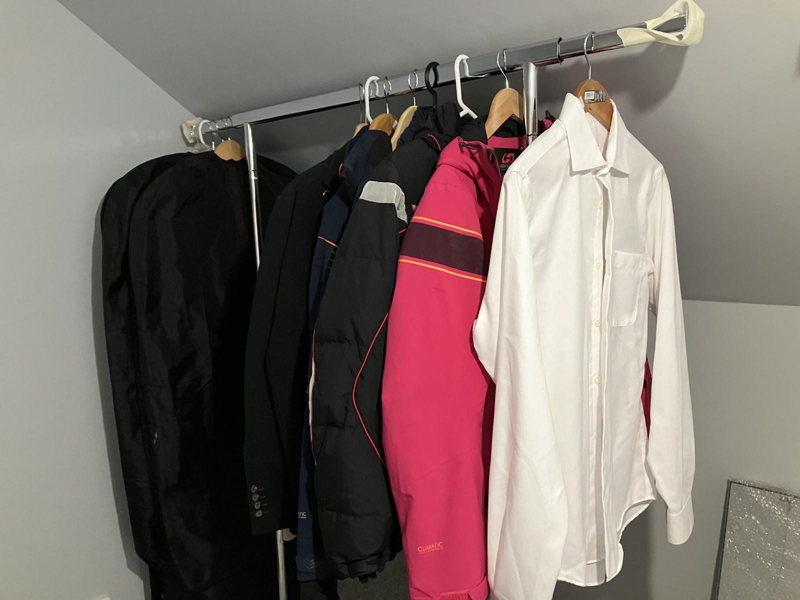 The first batch of clothes are hung. Mainly suits, dresses and winter jackets.