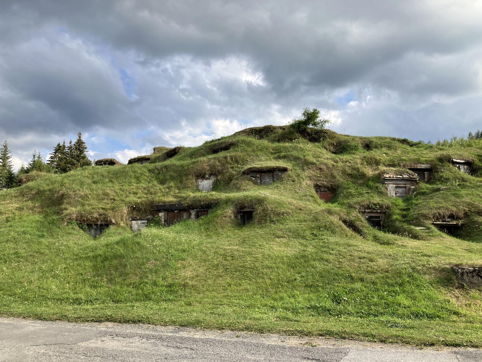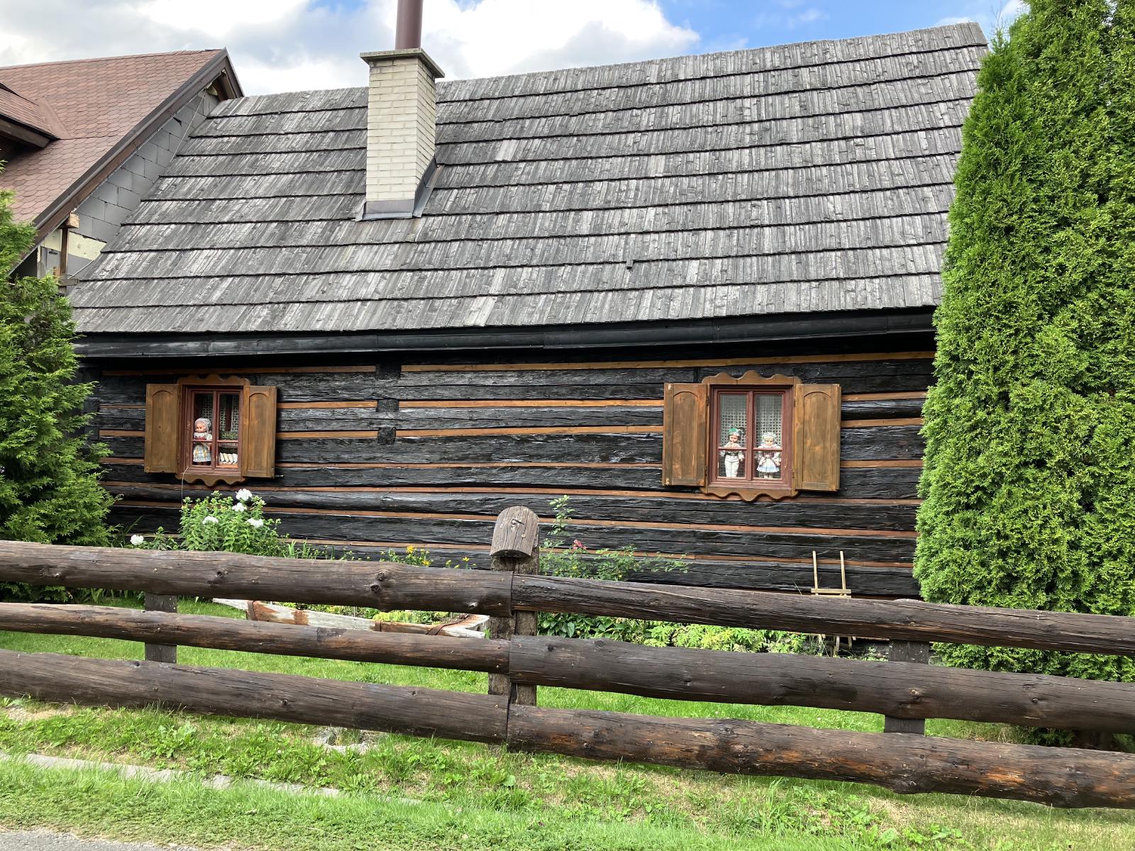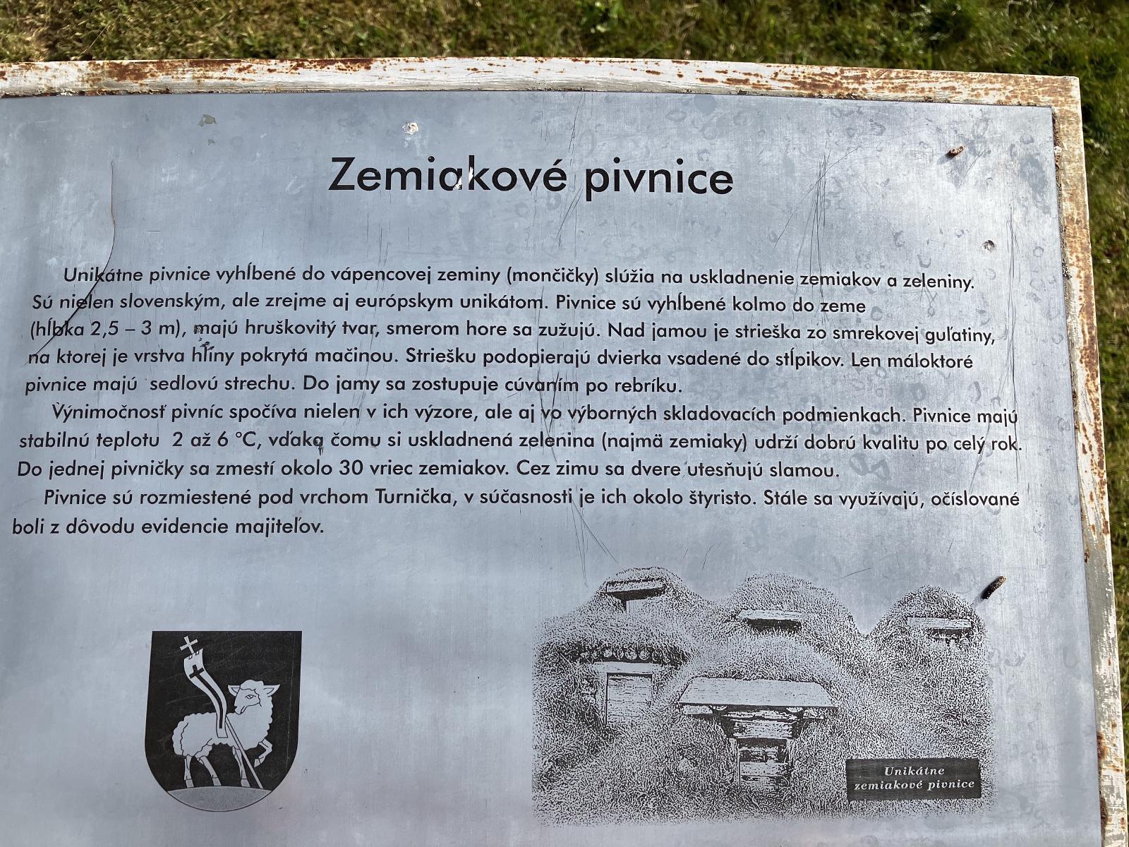 Unique cellars dug into the limestone are used to store potatoes and vegetables. They are not unique to Slovakia but are found across other parts of Europe as well. The cellars are hollowed out perpendicular to the ground (depth 2.5 - 3 meters) are pear-shaped and taper upwards. Above the cellar is a roof of spruce logs, above which is a layer of clay and then turf above. The roof is supported by the doors and door jamb. Only a few cellars have a gable roof. One descends into the cellar by a ladder.