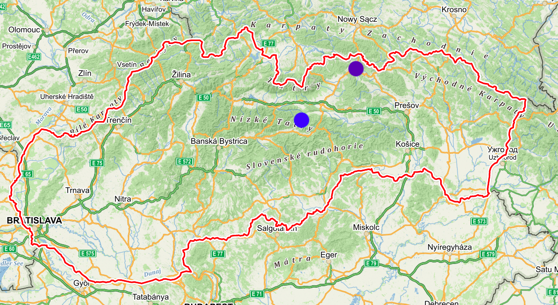 We spent the week in Slovakia visiting Stano’s parents and decided to take a day trip to the Low Tatras - a mountain range in central Slovakia. In the map below, the purple dot is where Stano’s parents live and the blue dot is where we went hiking.